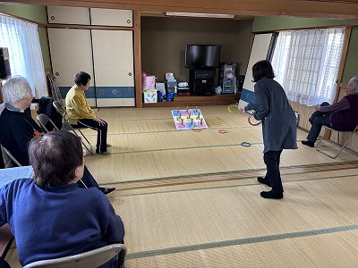 この日も、まずは「元気ぐんぐん体操」でしっかりと筋力トレーニングに取り組まれました。その後は、町内の各サロンでも人気の「ボッチャ」の体験や、恒例の「わなげ」を行い、会場は大いに盛り上がりました。