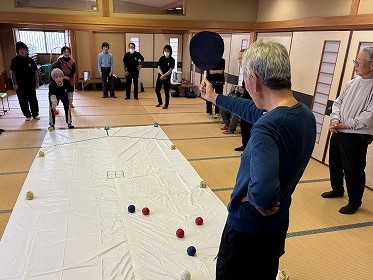 午前中は元気ぐんぐん体操に取り組まれ、皆さんでお食事を楽しんだ後、午後からは現在太子町内の各所のサロンで取り組まれている「ボッチャ」を体験されました。
