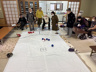 “ボッチャ”は誰もが気軽に楽しめるスポーツで、町内のあちらこちらのサロンでも取り組まれています。まずはボールの投げ方やルールの説明の後、実際に試合をして皆さんで盛り上がりました。