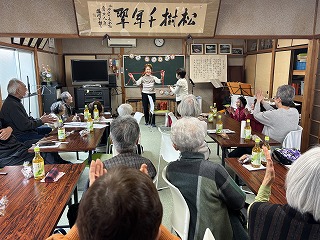 DVDを見ながら体操に取り組んだ後、今回は、富田林市の落語サークル「富福亭」さんに来ていただき、落語と尺八演奏を披露いただきました。「狐に化かされた旅人の話」「博打好きの若者の話」の落語や、お馴染みの曲を尺八で演奏していただき、皆さんで楽しい時間を過ごされました。