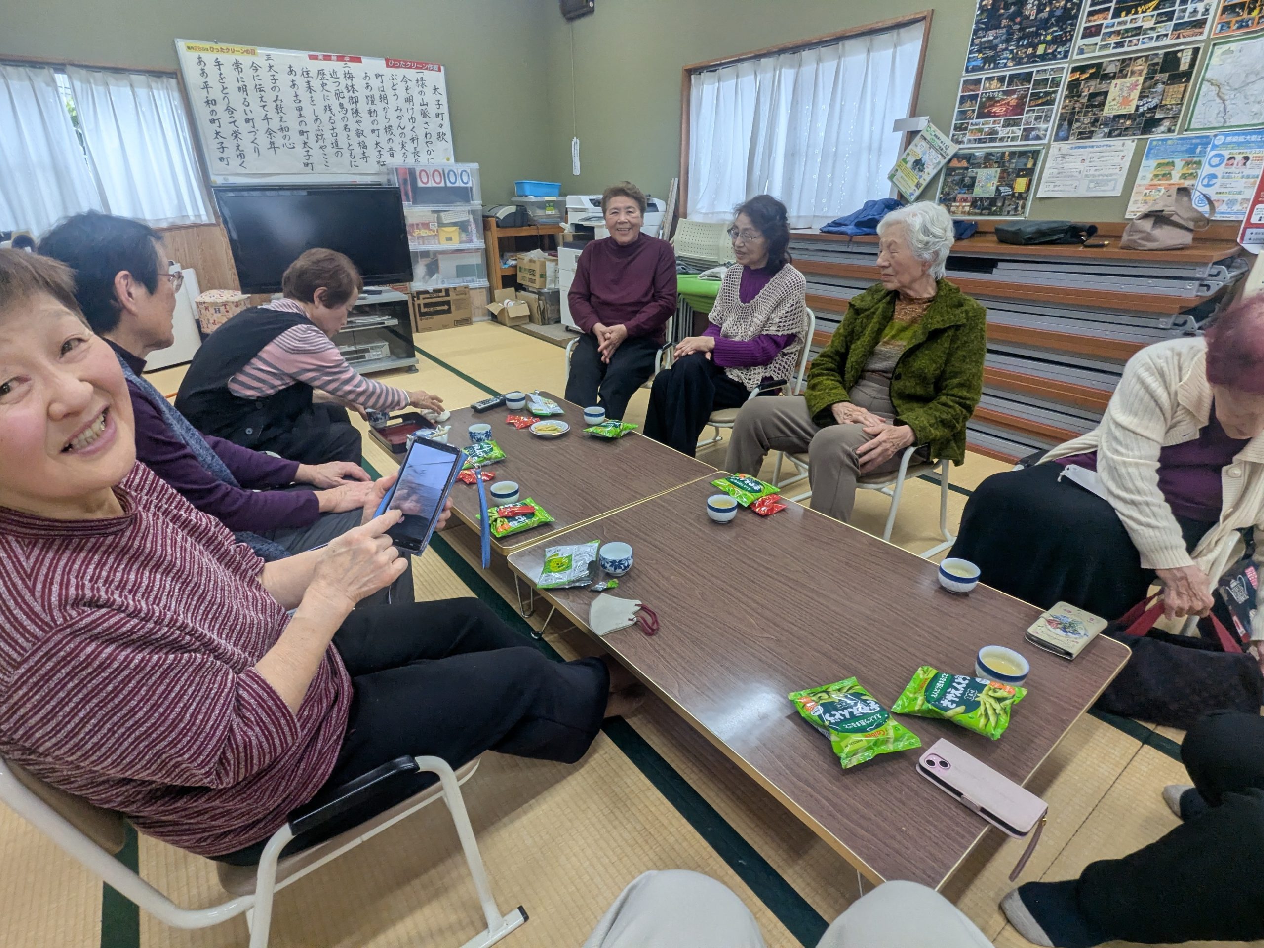 温かいお茶とお菓子を囲んでのおしゃべりタイムでは、ご近所の話題に花が咲きました。