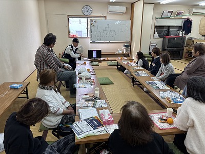 11/22(水)『大道かかしの会』が行われました。今回は正泉寺さんのご厚意でお寺の本堂をお借りしての開催となりました。ヤクルトの栄養士さんによる漢字脳トレや腸の健康に関するお話の後、たいしくん元気体操や太子郷土かるたなどを楽しみました。